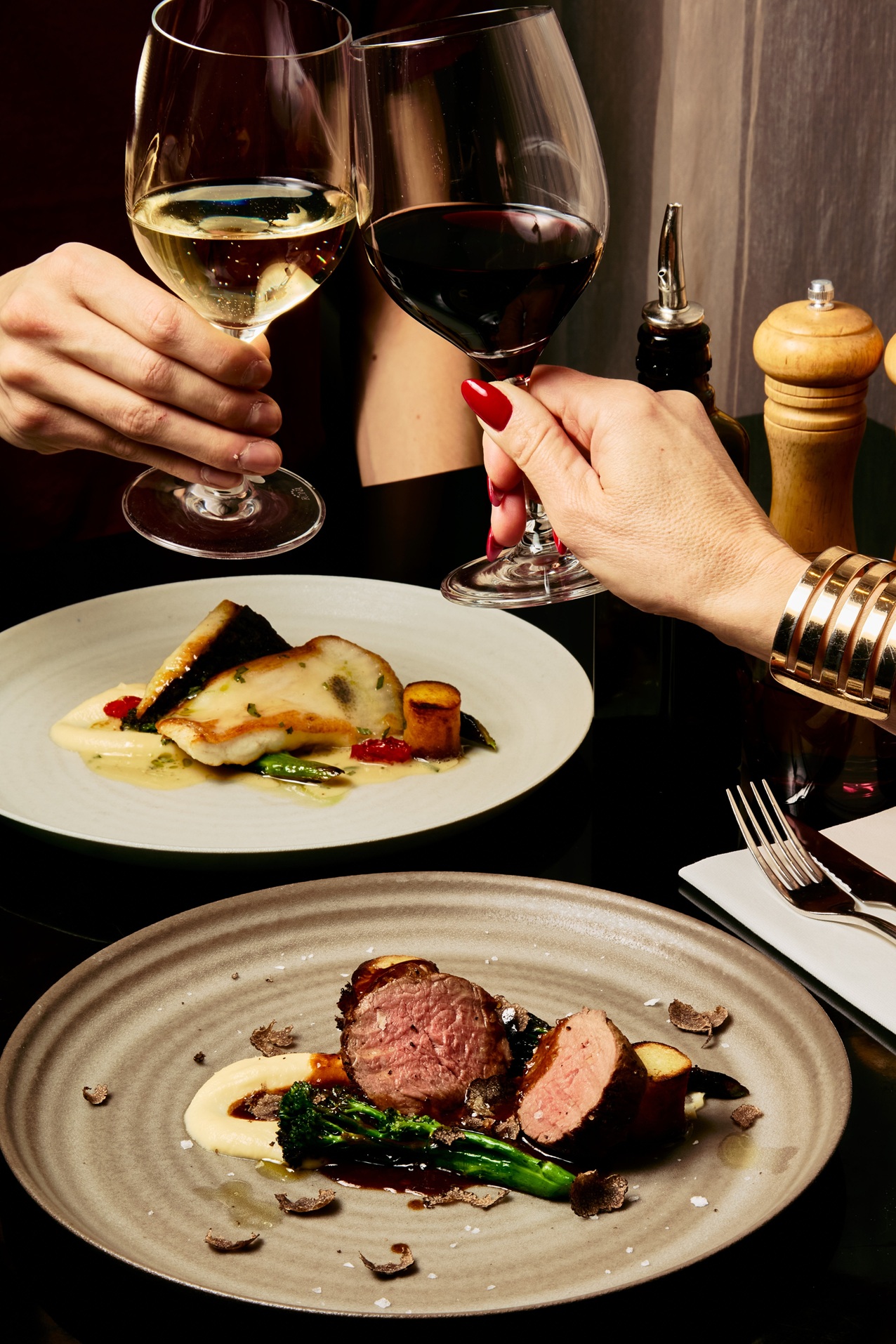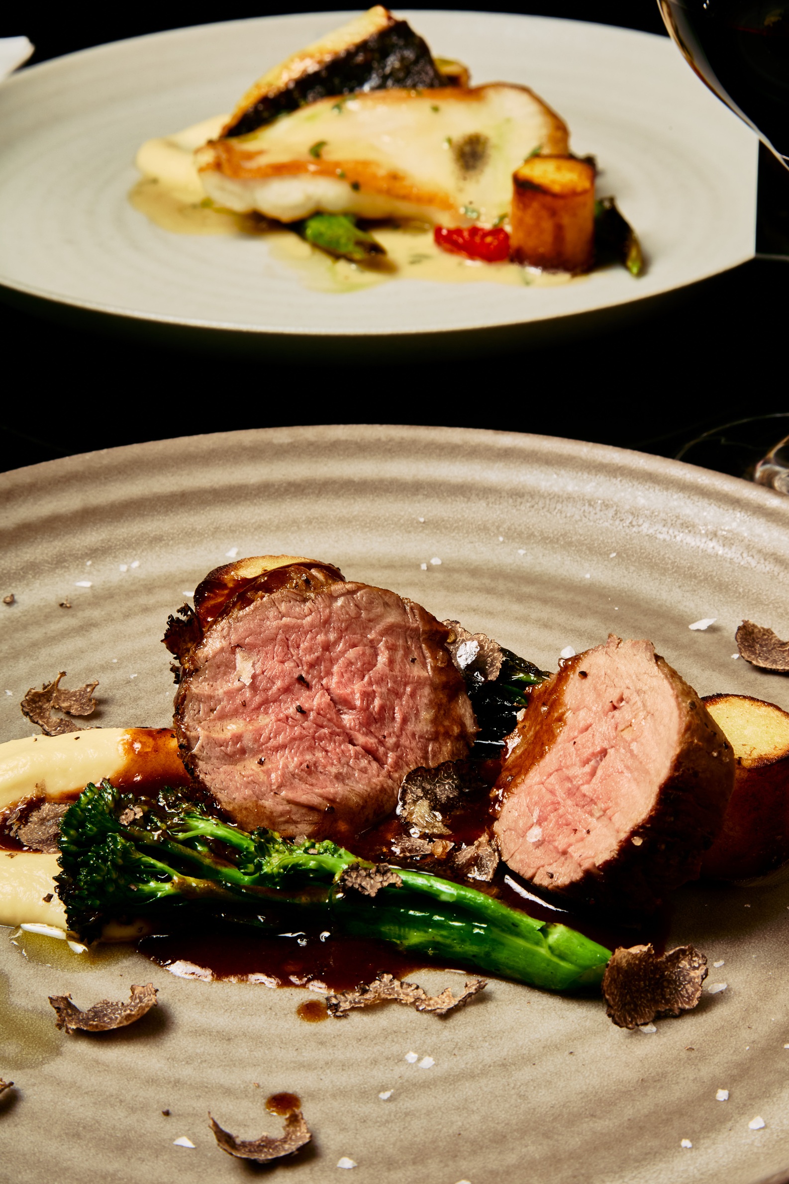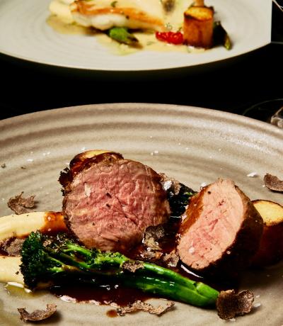 Hovězí steak ze svíčkové s pastiňákovým pyré, grilovanou brokolicí, čerstvým lanýžem a konfitovanými brambory